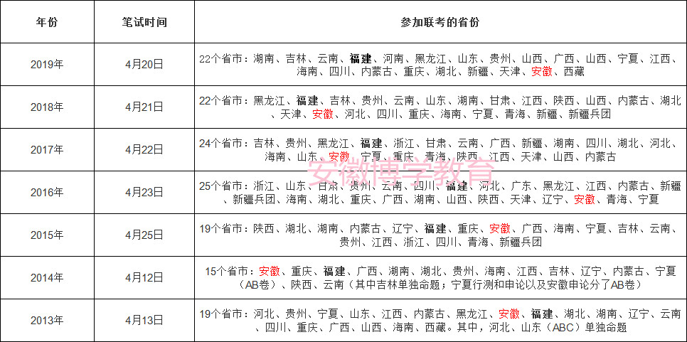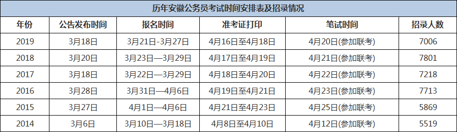 歷年安徽省公務(wù)員考試時間安排及招錄情況供大家參考(如下圖):