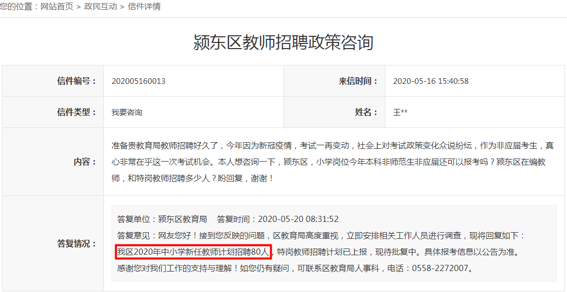 內(nèi)容:準(zhǔn)備貴教育局教師招聘好久了,今年因?yàn)樾鹿谝咔?,考試一再變?dòng),社會(huì)上對(duì)考試政策變化眾說紛紜,作為非應(yīng)屆考生,真心非常在乎這一次考試機(jī)會(huì)。本人想咨詢一下,潁東區(qū),小學(xué)崗位今年本科非師范生非應(yīng)屆還可以報(bào)考嗎?潁東區(qū)在編教師,和特崗教師招聘多少人?盼回復(fù),謝謝!答復(fù)情況: