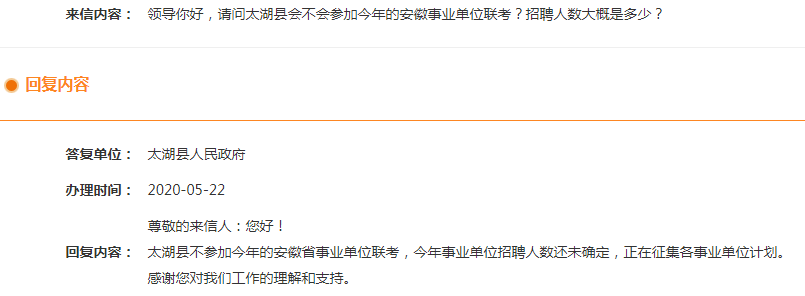 來信內(nèi)容:領(lǐng)導(dǎo)你好,請問太湖縣會不會參加今年的安徽事業(yè)單位聯(lián)考?招聘人數(shù)大概是多少?