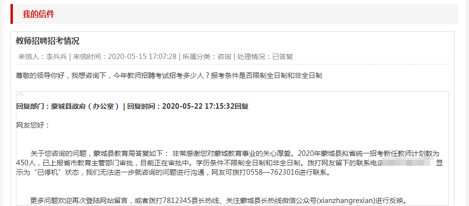 更多問(wèn)題歡迎再次登陸網(wǎng)站留言,或者撥打7812345縣長(zhǎng)熱線、關(guān)注蒙城縣長(zhǎng)熱線微信公眾號(hào)(xianzhangrexian)進(jìn)行反映。