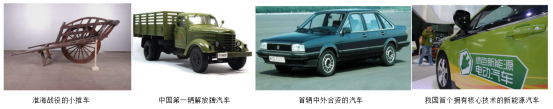 淮海戰(zhàn)役的小推車;中國第一輛解放牌汽車; 首輛中外合資的汽車; 我國首個擁有核心技術(shù)的新能源汽車??吹竭@四幅圖片你想到了什么?