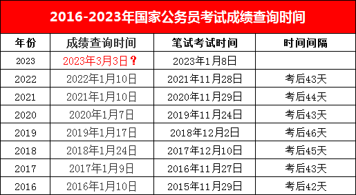 從上圖可以看出,往年國考筆試與成績發(fā)布間隔時間比較固定,在40多天,但截至今天,也就是3月2日,距離國考筆試已經(jīng)過了51天了,小編預測接下來的每天都有可能會出啊,大家要多多關注報名網(wǎng)站,及時查詢成績。