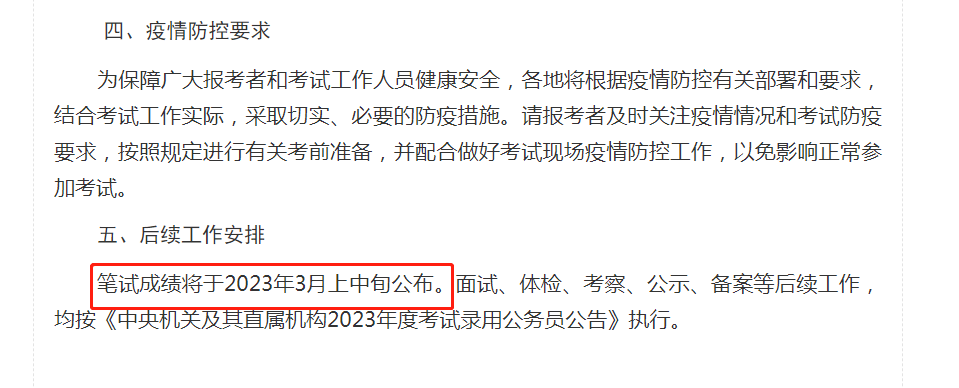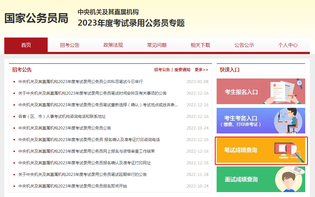 2022年12月16日,國家公務員局發(fā)布了《關于中央機關及其直屬機構(gòu)2023年度考試錄用公務員筆試時間安排及有關事項的公告》,其中有提到關于國考成績發(fā)布的時間:筆試成績將于2023年3月上中旬公布。