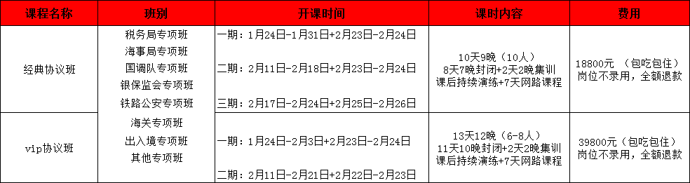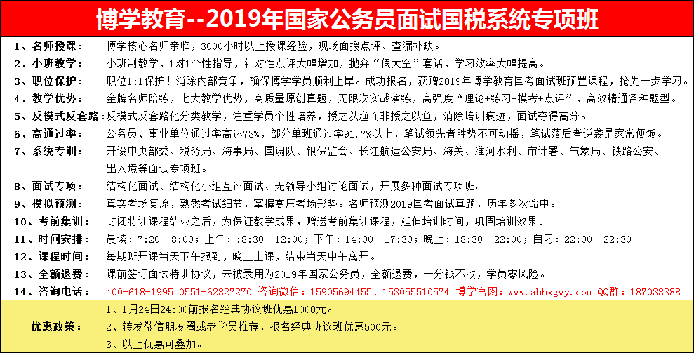 詳見協(xié)議(包括培訓(xùn)費(fèi)、教材費(fèi)、住宿費(fèi)、餐費(fèi)、水果點(diǎn)心費(fèi)等一切費(fèi)用)。學(xué)員無論任何情況未被錄用為2019年國(guó)家公務(wù)員,我校將退還全部費(fèi)用。