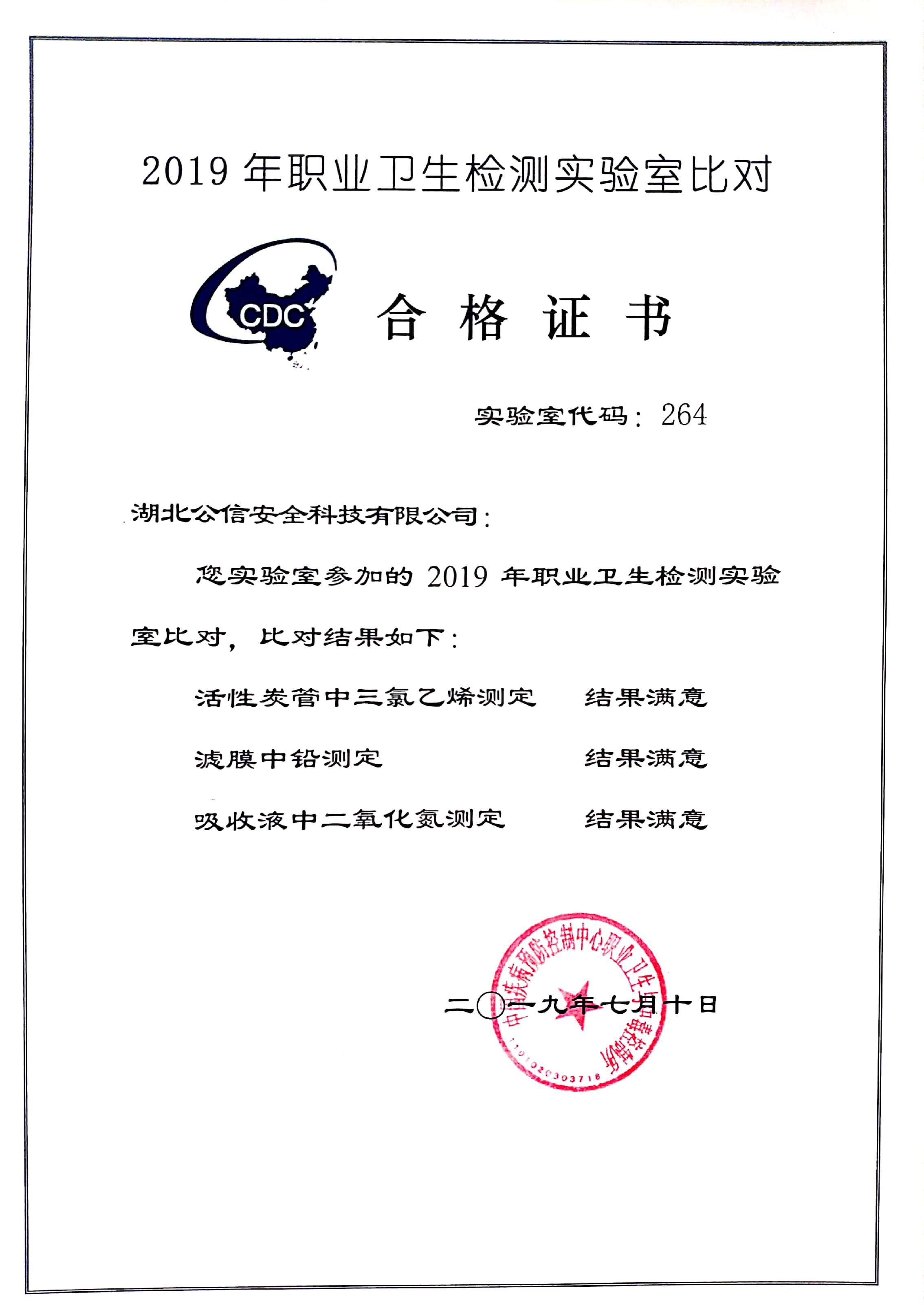 2019年7月10日,湖北公信安全科技有限公司在中國疾控中心組織的實(shí)驗(yàn)室能力比對活動(dòng)中取得三項(xiàng)檢測結(jié)果均為“滿意”的成績。